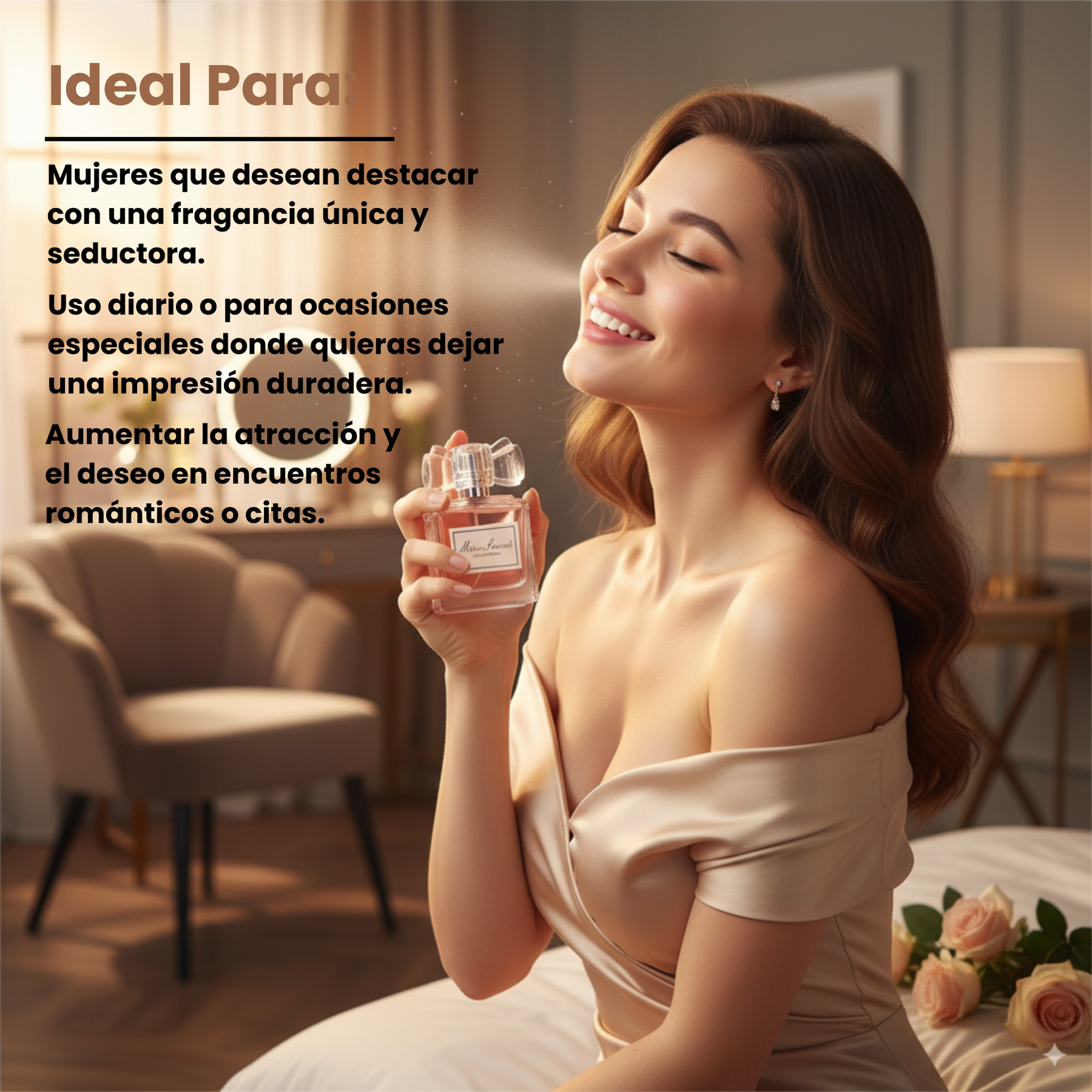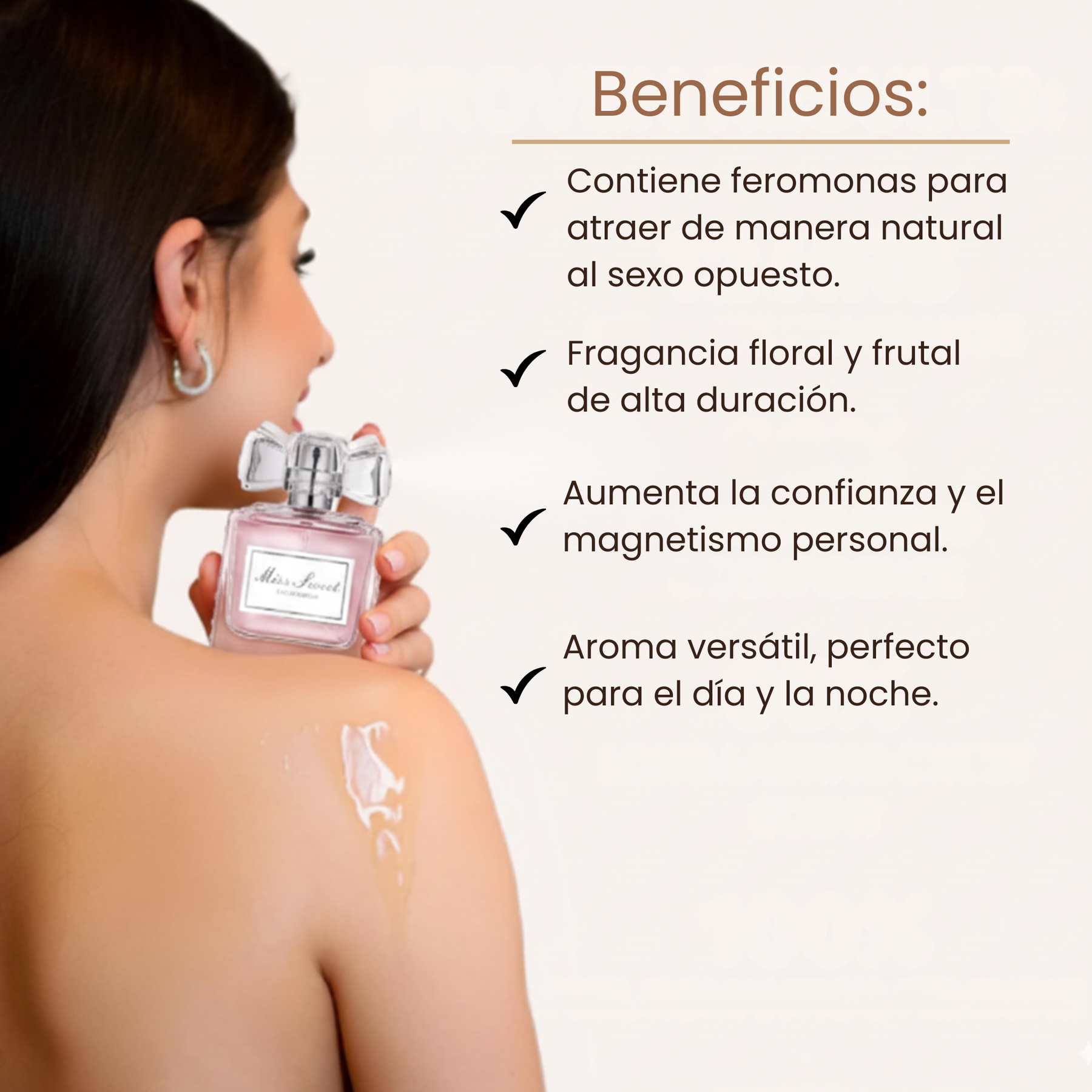 What makes this perfume truly special is its content of active pheromones, which naturally stimulate attraction and increase emotional connection, helping you subtly but powerfully draw male attention and desire.