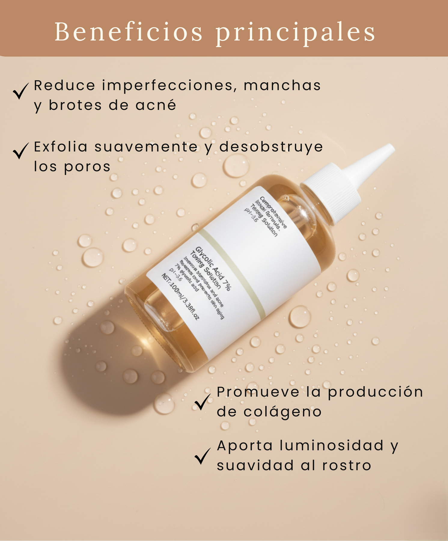 - Ácido Glicólico 7%: exfoliante químico que mejora imperfecciones y aporta luminosidad